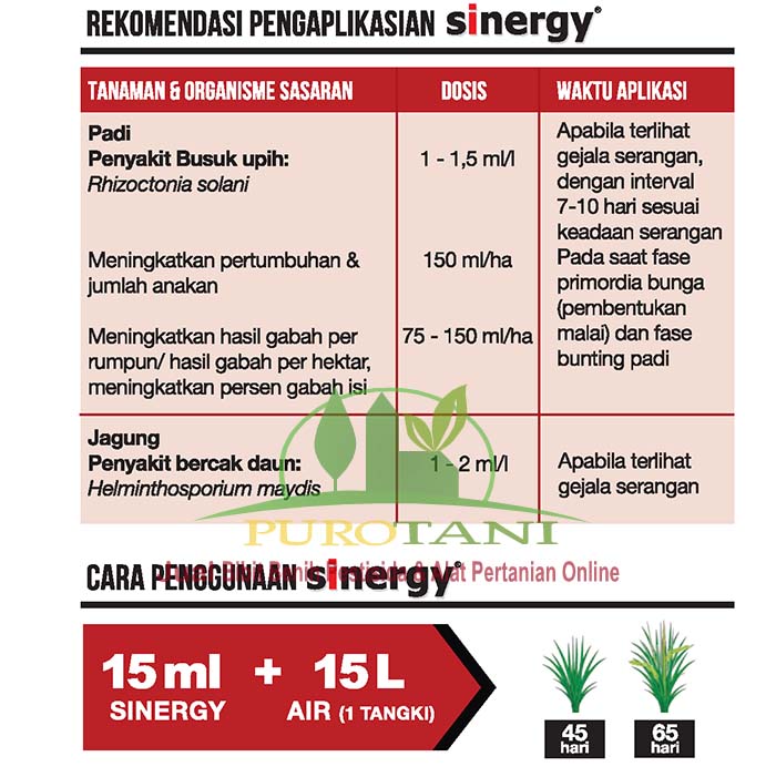 SINERGY 300 EC merupakan fungisida sistemik dan zat pengatur tumbuh tanaman.Termasuk fungisida dari golongan Triazol. Fungisida ini cocok digunakan untuk mengendalikan penyakit busuk upih pada padi, penyakit bercak daun pada jagung dan penyakit bercak ungu pada bawang merah serta meningkatkan pertumbuhan dan hasil tanam padi.
